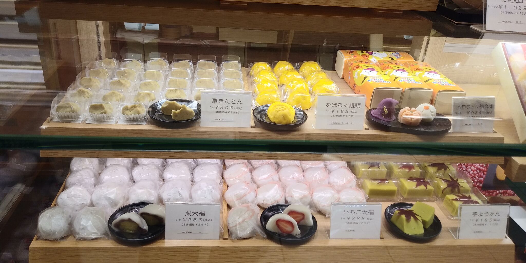 季節商品か、「栗きんとん」「かぼちゃ饅頭」「ハロウィン詰合せ」が並んでいました。