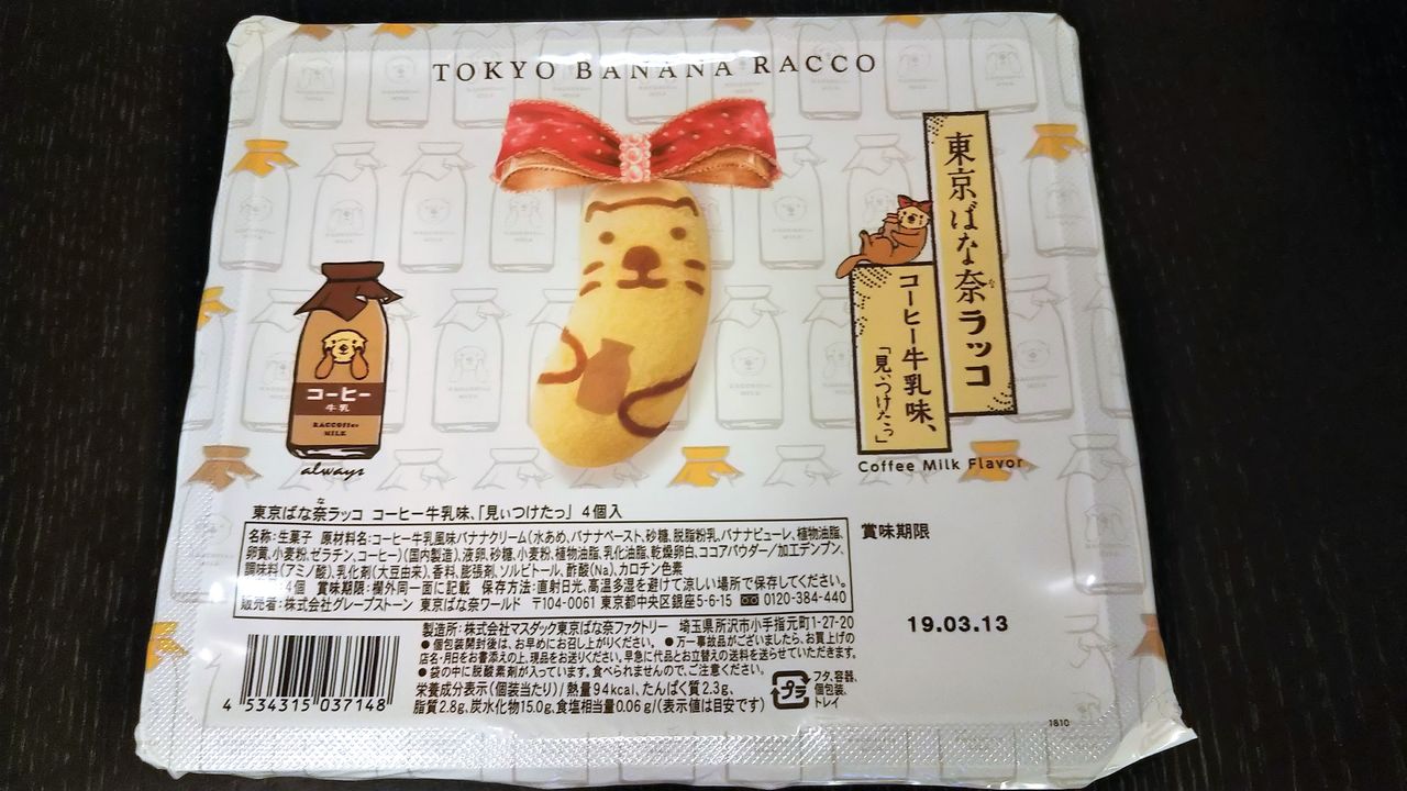 原材料:コーヒー牛乳風味バナナクリーム(水あめ、バナナペースト、砂糖、脱脂粉乳、バナナピューレ、植物油脂、卵黄、小麦粉、ゼラチン、コーヒー)(国内製造)、液卵、砂糖、小麦粉、植物油脂、乳化油脂、乾燥卵白、ココアパウダー/加工デンプン、調味料(アミノ酸)、乳化剤(大豆由来)、香料、膨張剤、ソルビトール、酢酸(Na)、カロチン色素