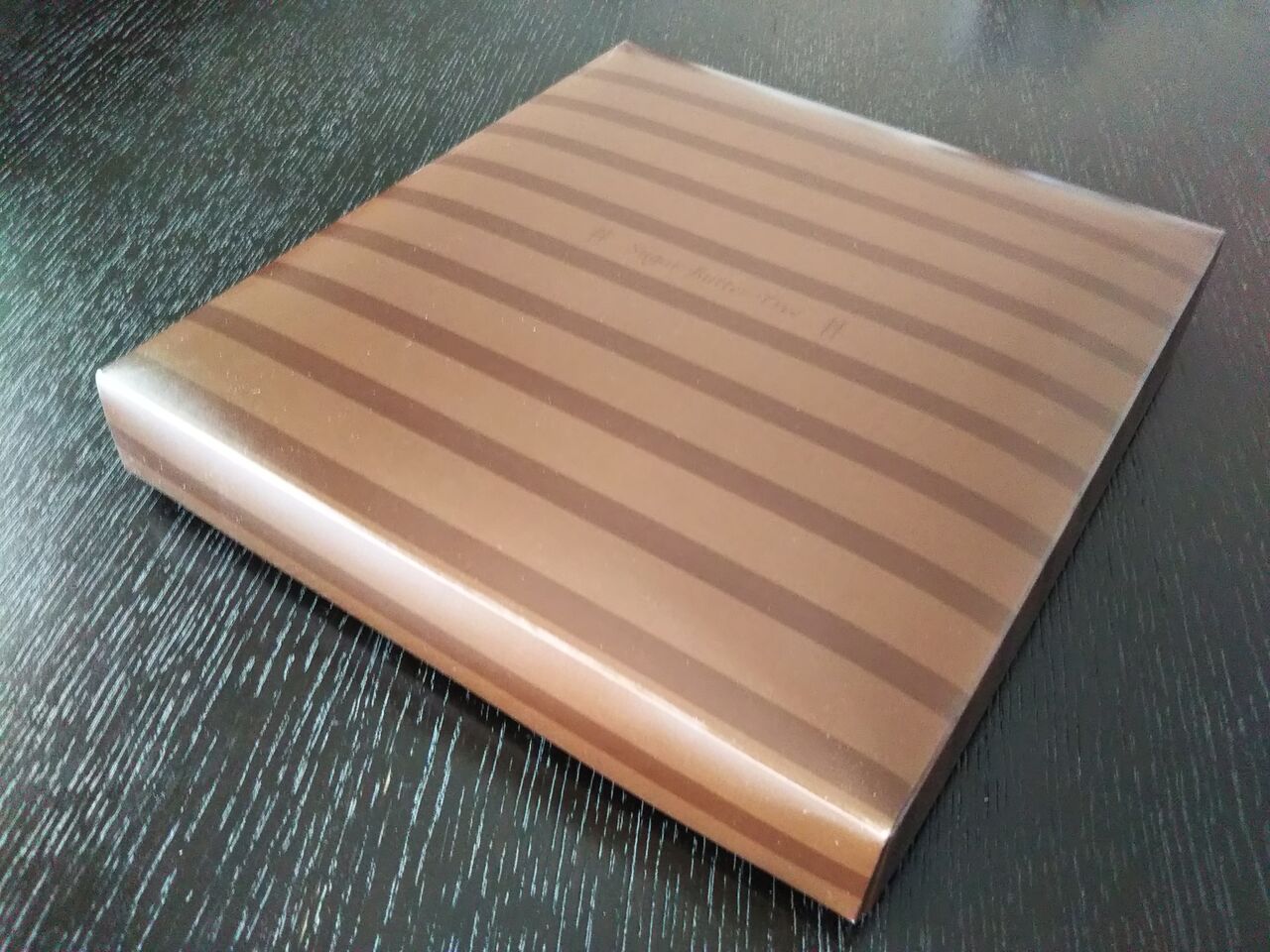 包装紙を外すと、シックな茶色のボーダー柄の箱が出てきます。